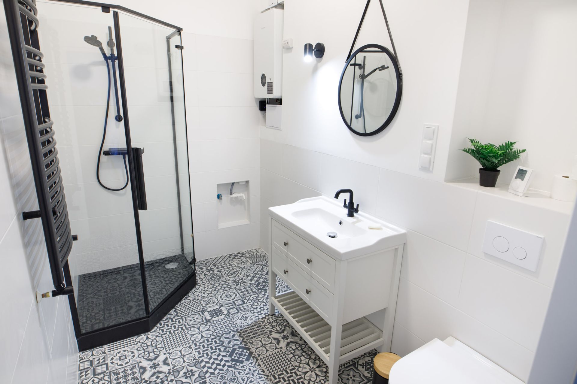 - Łazienka: Nowoczesny prysznic, toaleta i umywalka.