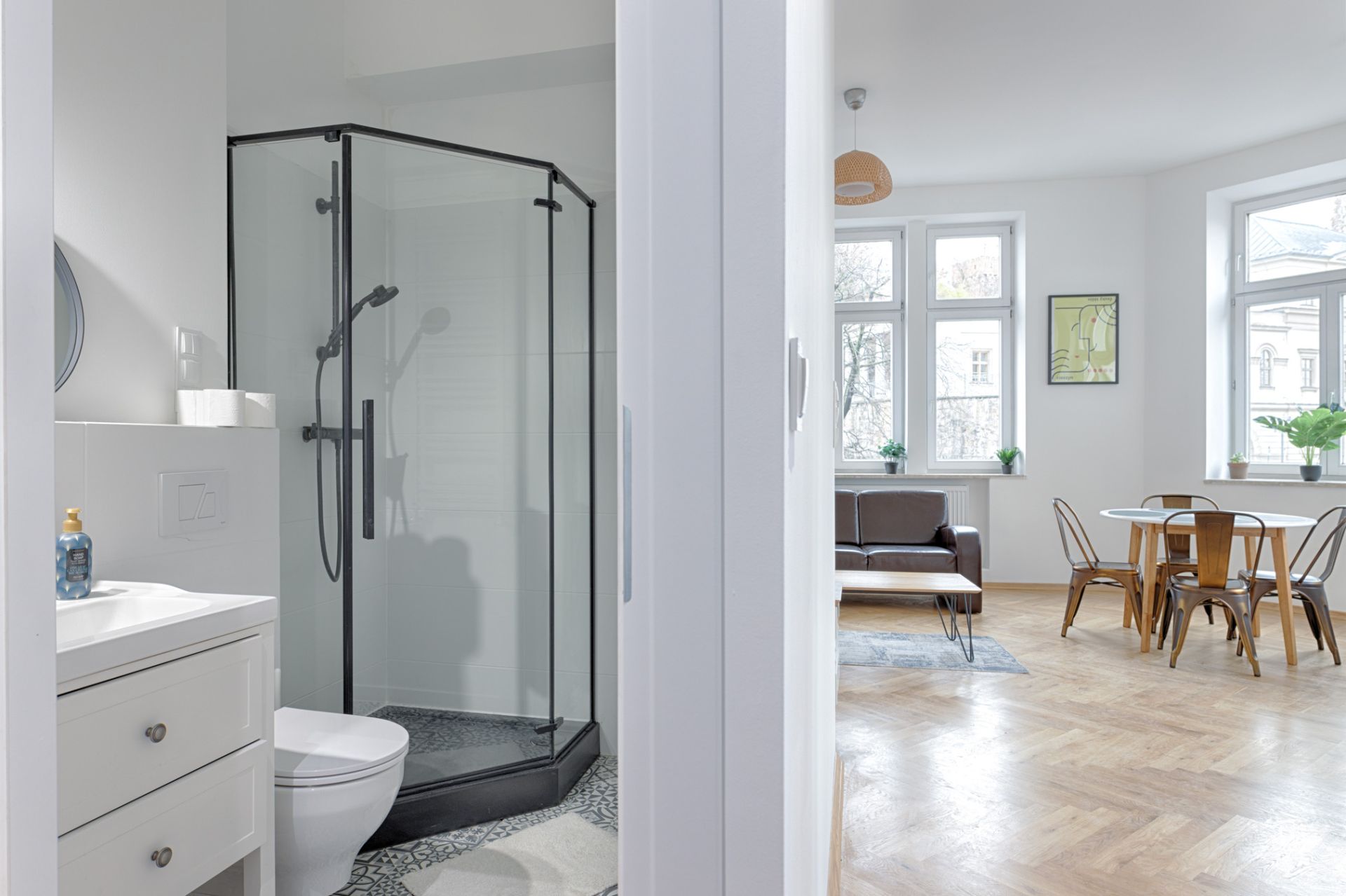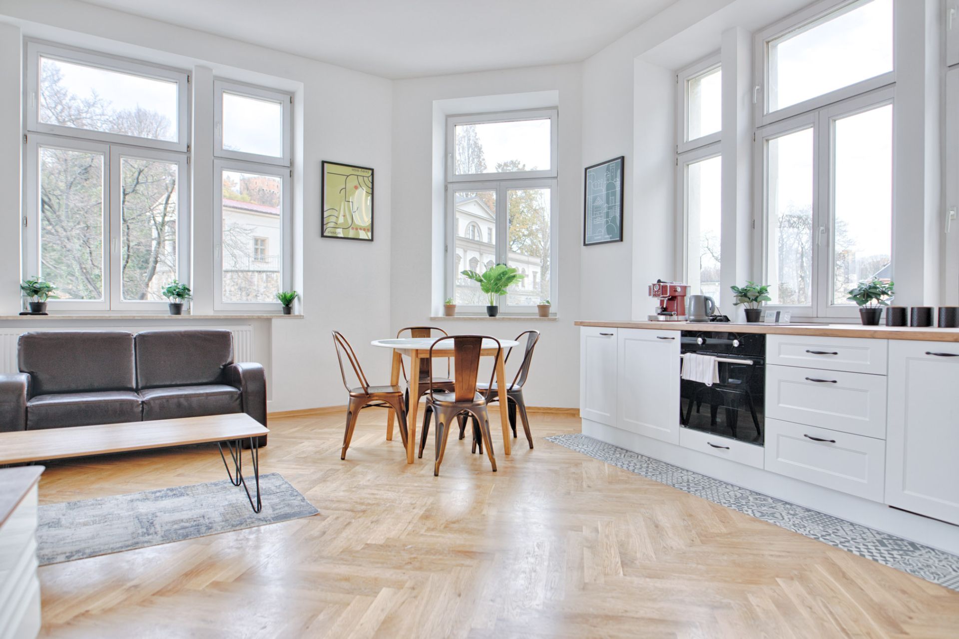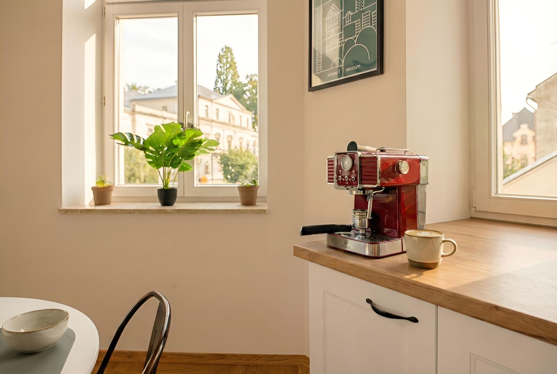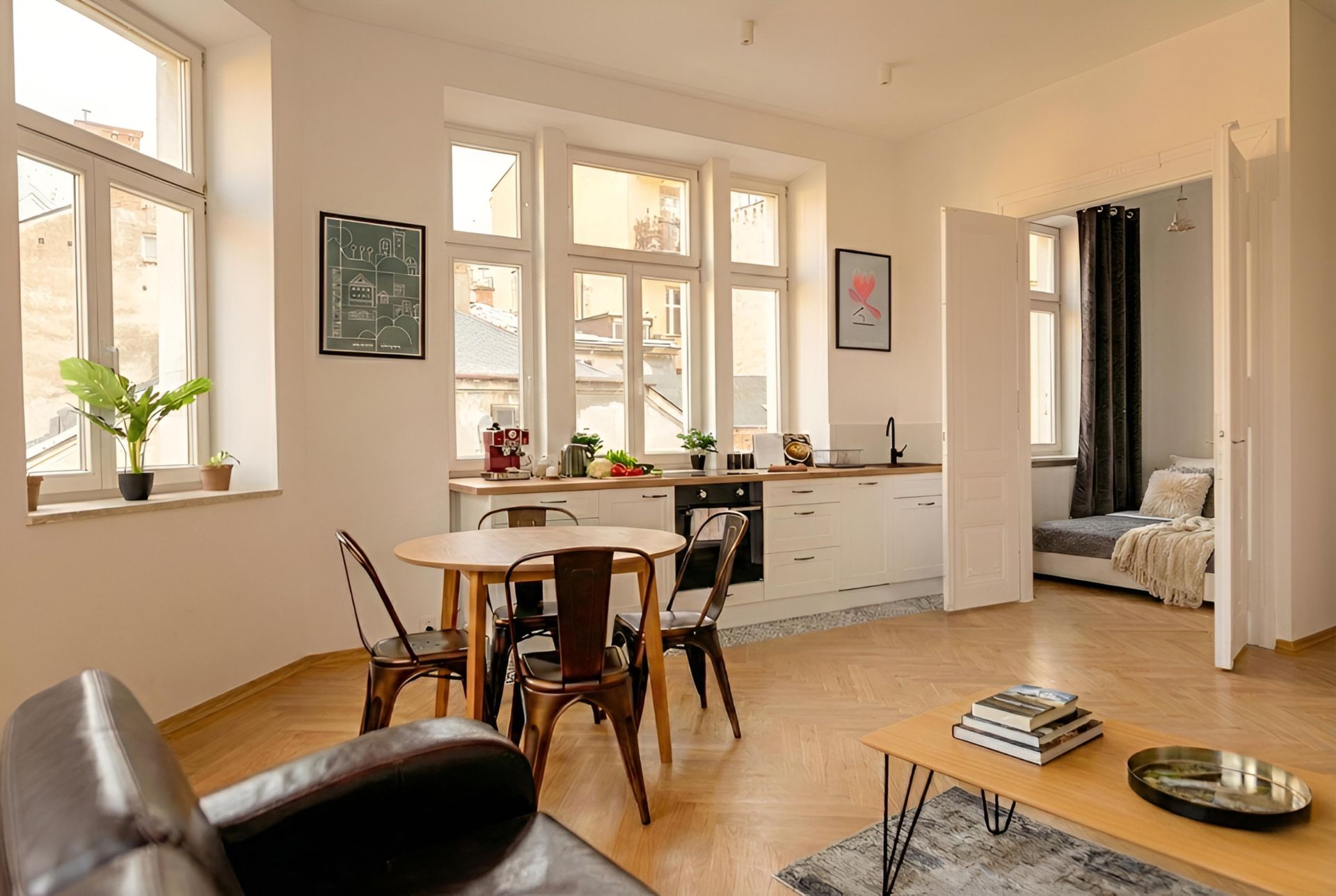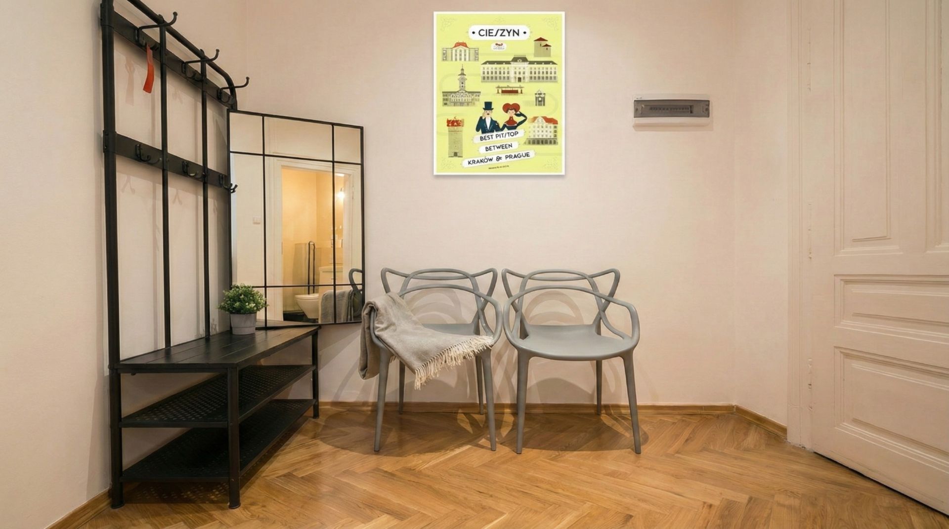 Apartament na Granicy 6 to przytulne mieszkanie w zabytkowej kamienicy z początku XX wieku, położone przy Moście Przyjaźni, tuż obok granicy. Znajduje się na drugim piętrze i wyróżnia się klimatycznym wykuszem, który dodaje mu wyjątkowego charakteru i oferuje niepowtarzalny widok na dawny Myśliwski Pałac Habsburgów, rzekę Olzę oraz replikę cieszyńskiego tramwaju.